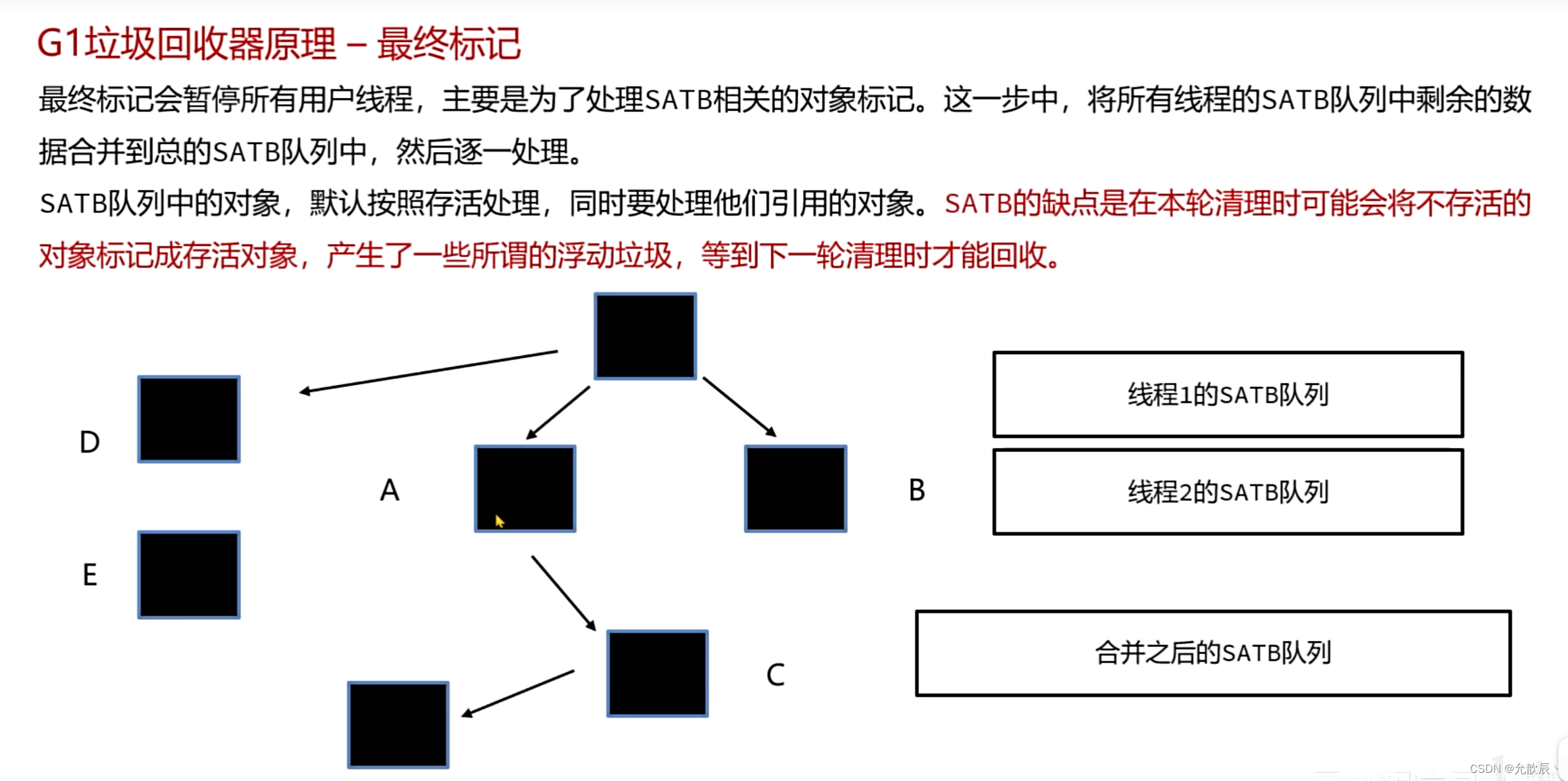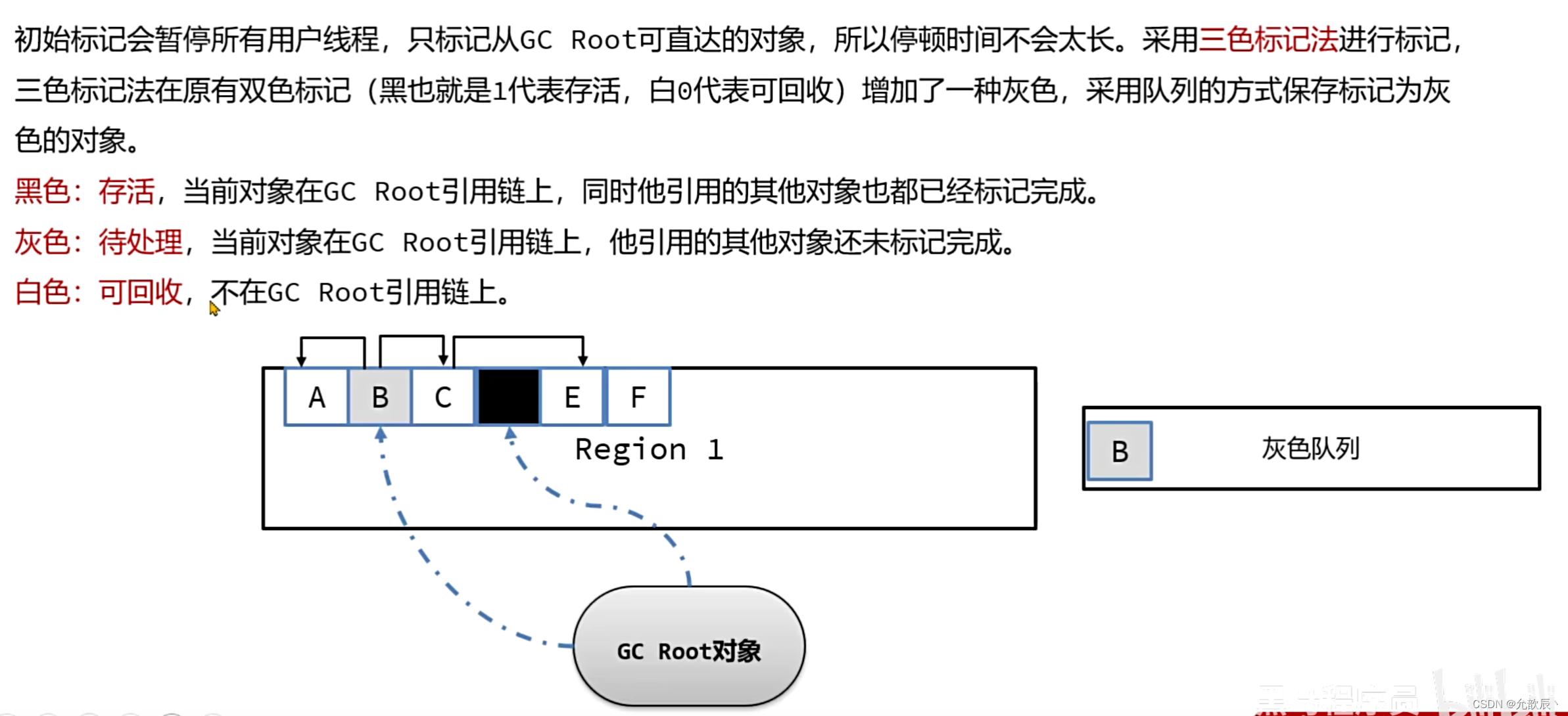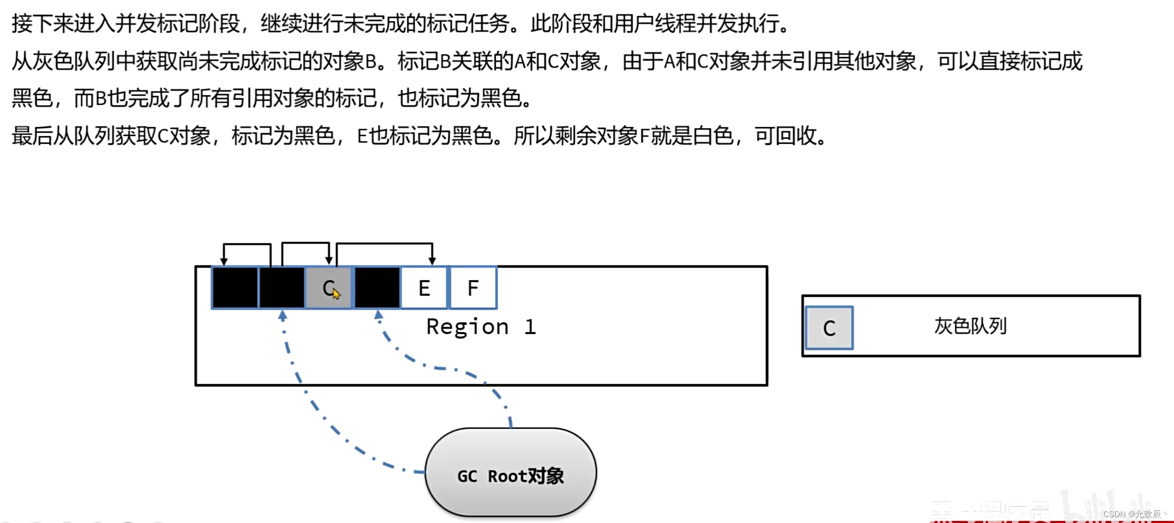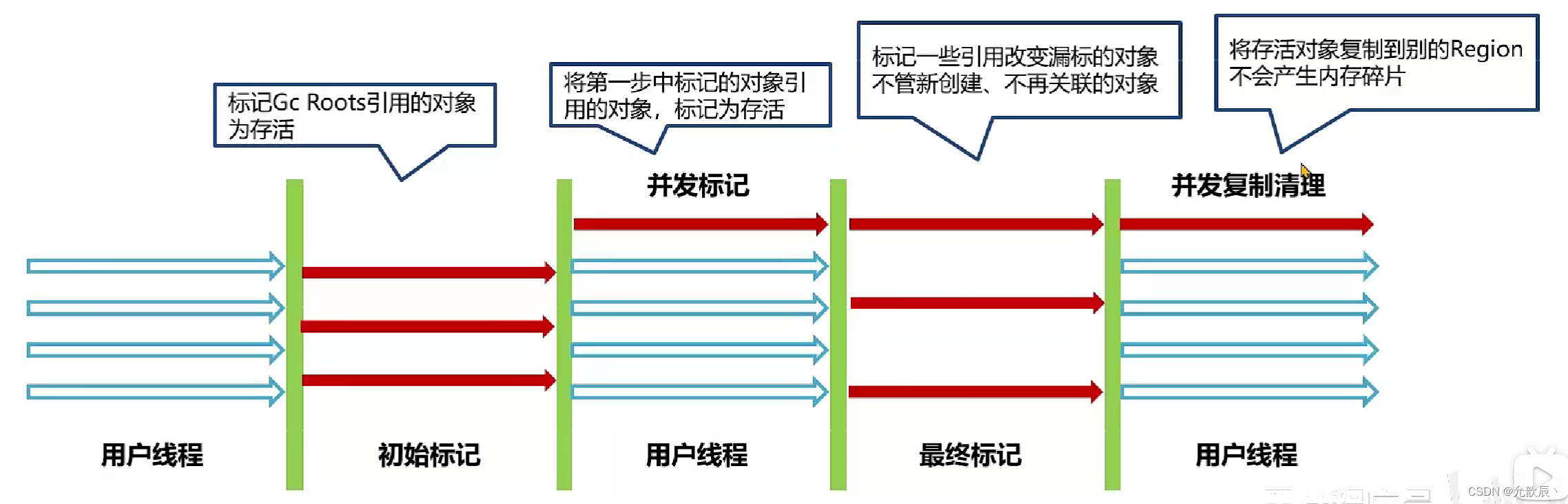 - 最终标记(暂停用户线程):对用户线程做一个短暂的暂停,用于处理并发标记阶段漏标的那部分对象。