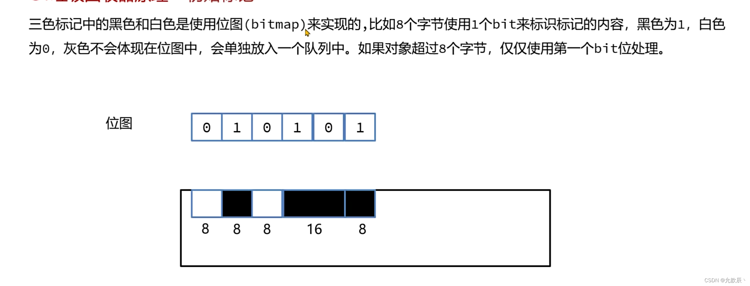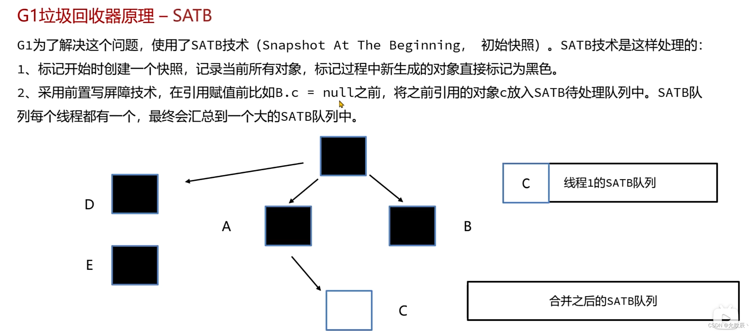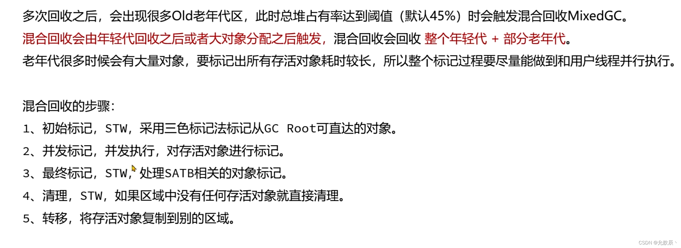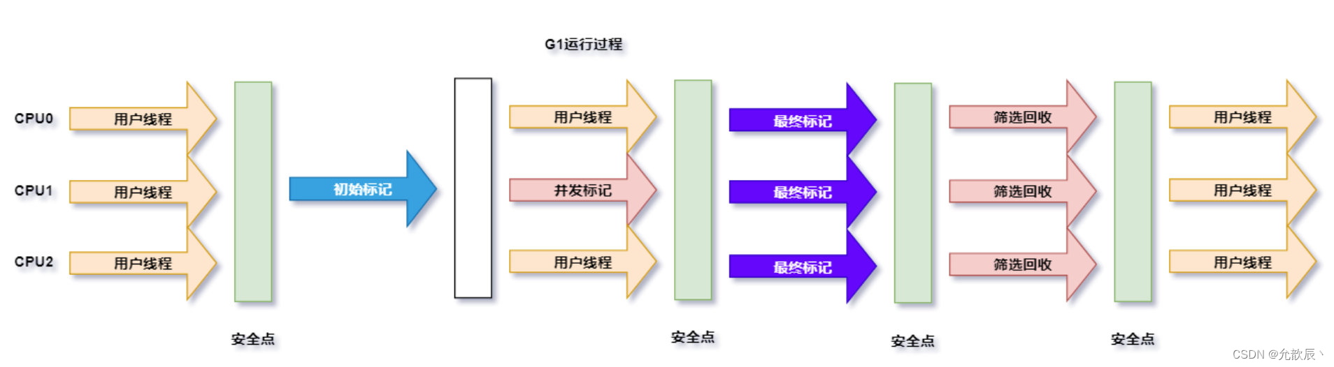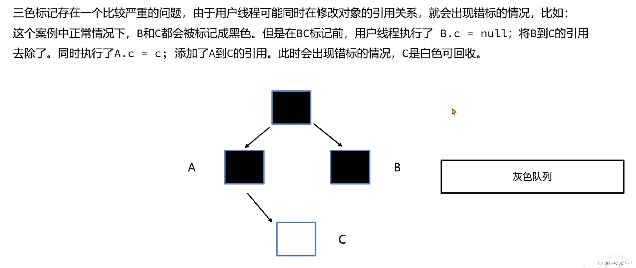 - 最终标记(暂停用户线程):对用户线程做一个短暂的暂停,用于处理并发标记阶段漏标的那部分对象。