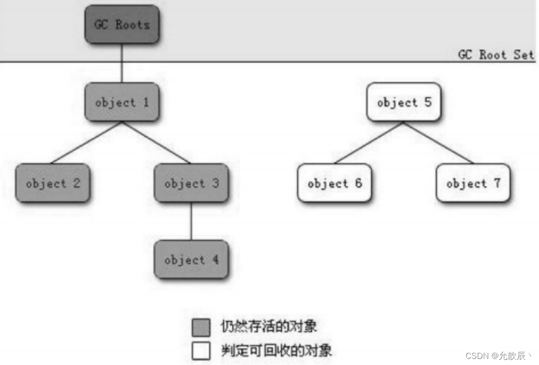 JVM中采用的是此算法的核心思想为 : 通过一系列称为"GC Roots"的对象作为起始点,从这些节点开始向下搜索,搜索走过的路径称之为"引用链",当一个对象到GC Roots没有任何的引用链相连时(从GC Roots到这个对象不可达)时,证明此对象是不可用的。以下图为例: