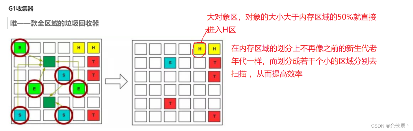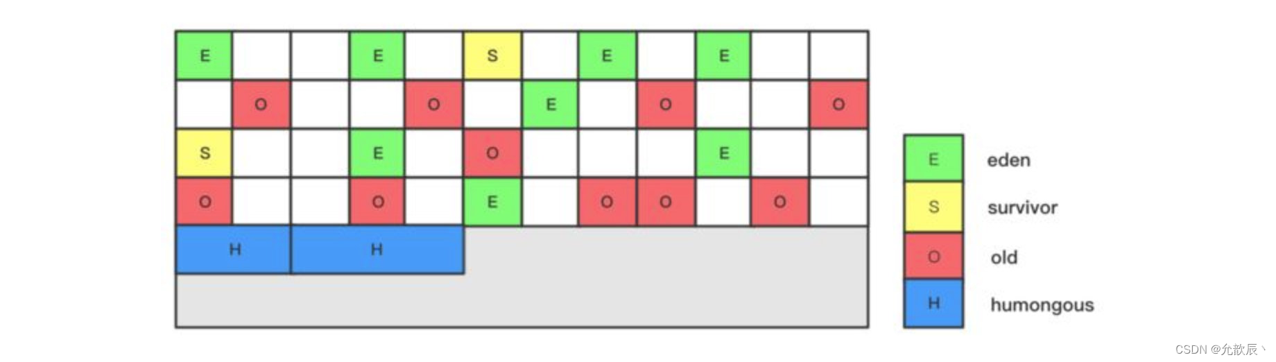 每一个Region都可以根据需要,自由决定扮演哪个角色(Eden、Survivor和老年代),收集器会根据对应的角色采用不同的回收策略。此外,G1收集器还存在一个Humongous区域,它专门用于存放大对象(一般认为大小超过了Region容量一半的对象为大对象,也可以横跨多个region)这样,新生代、老年代在物理上,不再是一个连续的内存区域,而是到处分布的。