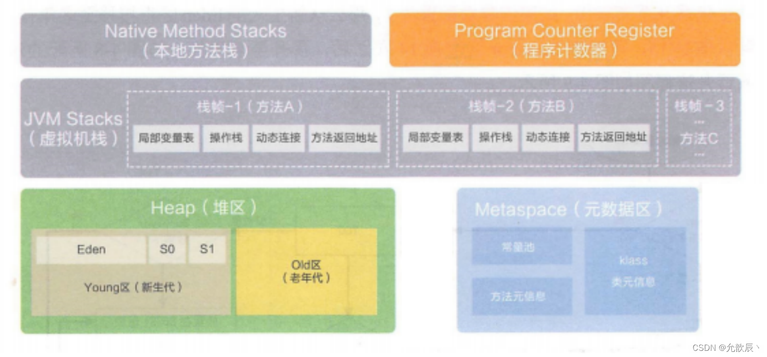 元空间:元空间的本质和永久代类似,都是对JVM规范中方法区的实现。不过元空间与永久代之间最大的区别在于:元空间并不在虚拟机中,而是使用本地内存。