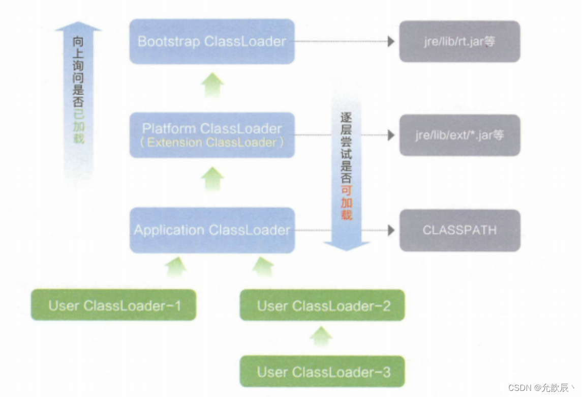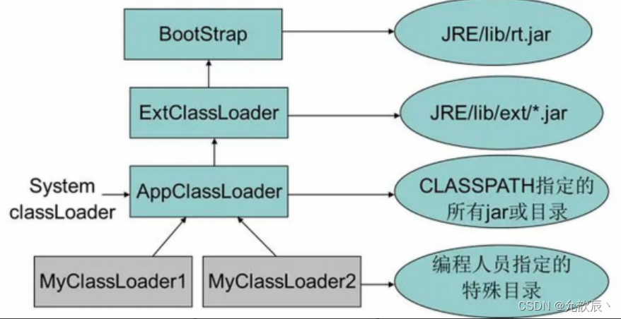 - 用户自定义类加载器(User-defined Class Loader):这是开发人员根据需要自己实现的类加载器。用户自定义类加载器可以根据特定的加载策略和需求来加载类,例如从特定的网络位置、数据库或其他非传统来源加载类。