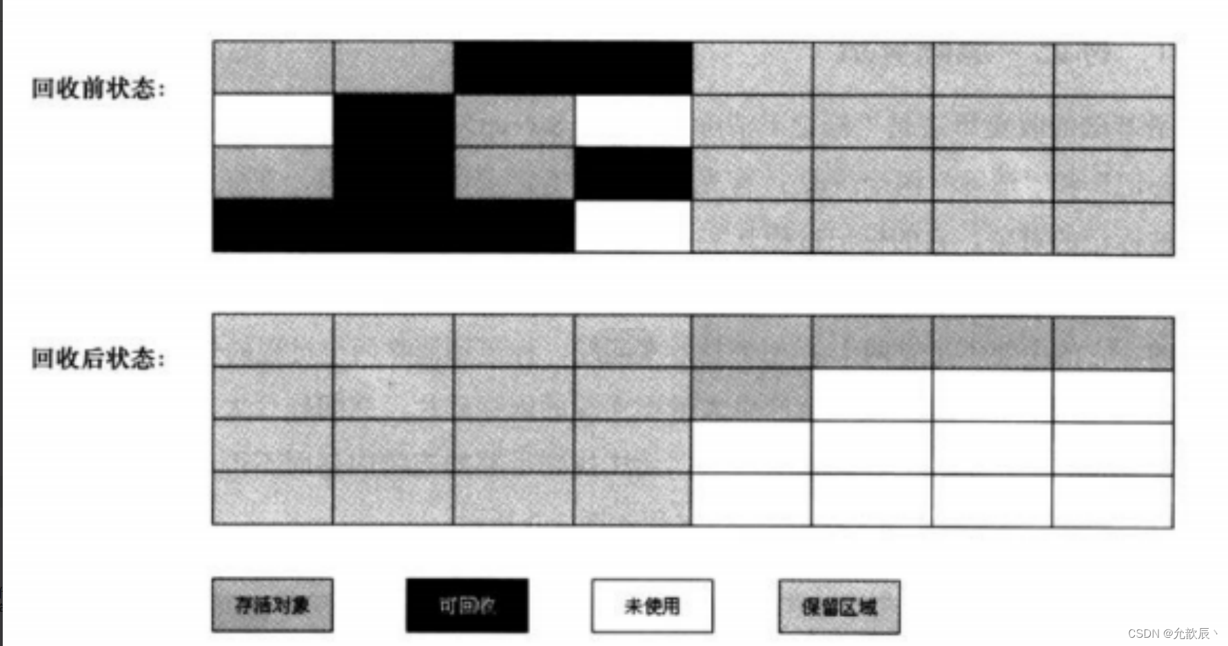 " 复制 " 算法是为了解决 " 标记 - 清理 " 的效率问题。它将可用内存按容量划分为大小相等的两块,每次只使用其中的一块。当这块内存需要进行垃圾回收时,会将此区域还存活着的对象复制到另一块上面,然后再把已经使用过的内存区域一次清理掉。这样做的好处是每次都是对整个半区进行内存回收,内存分配时也就不需要考虑内存碎片等复杂情况,只需要移动堆顶指针,按顺序分配即可。此算法实现简单,运行高效。算法的执行流程如下图 :