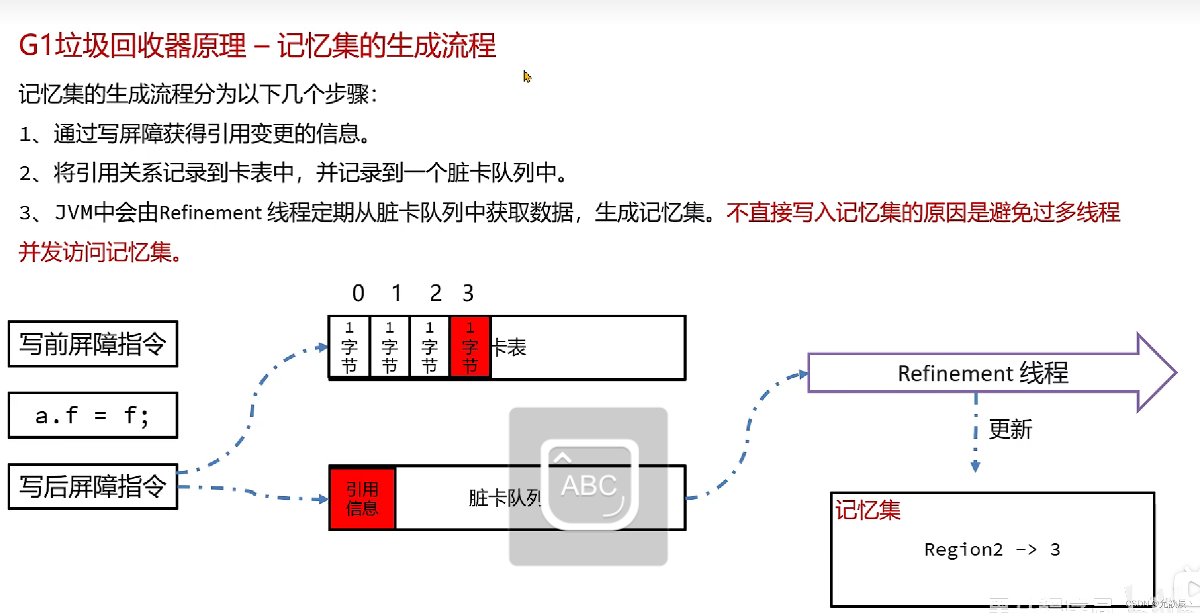 为什么不直接将卡表的脏卡信息直接同步到记忆集?因为写后屏障指令是由用户线程执行的,如果有大量用户线程直接修改记忆集的数据,会产生线程安全的问题,如果直接加锁用户线程的性能会大大下降。所以我们将脏卡信息同步到脏卡队列中,由指定的线程来更新记忆集的信息。