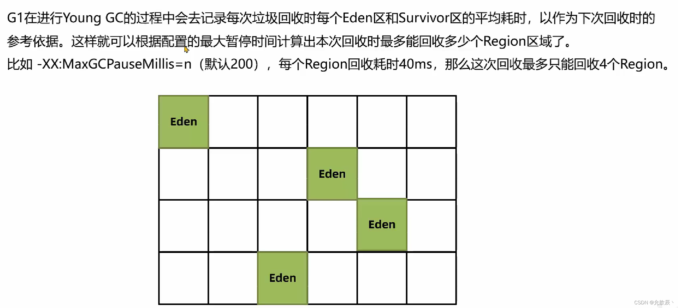 G1的整个堆会被划分成多个大小相等的区域,称之为区Region,区域不要求是连续的。分为Eden、SurvivoOld区。Region的大小通过堆空间大小/2048计算得到,也可以通过参数-XX:G1HeapRegionSize=32M指定,Region size必须是2的指数幂,取值范围从1M到32M。