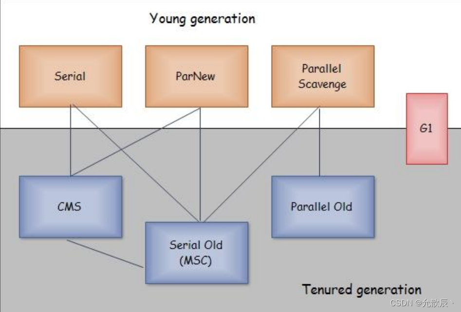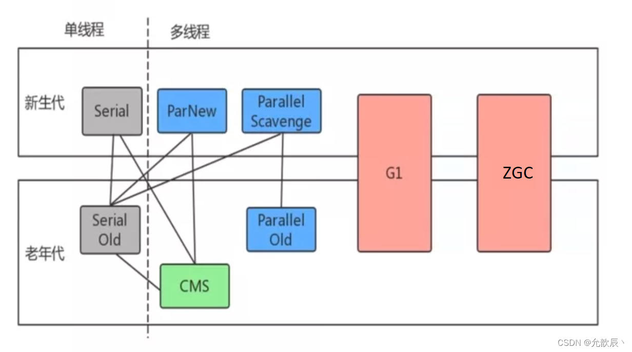 聊完了对象存活判定和垃圾回收算法,接着我们就要看看具体有哪些垃圾回收器的实现了。我们可以自由地为新生代和老年代选择更适合它们的收集器。