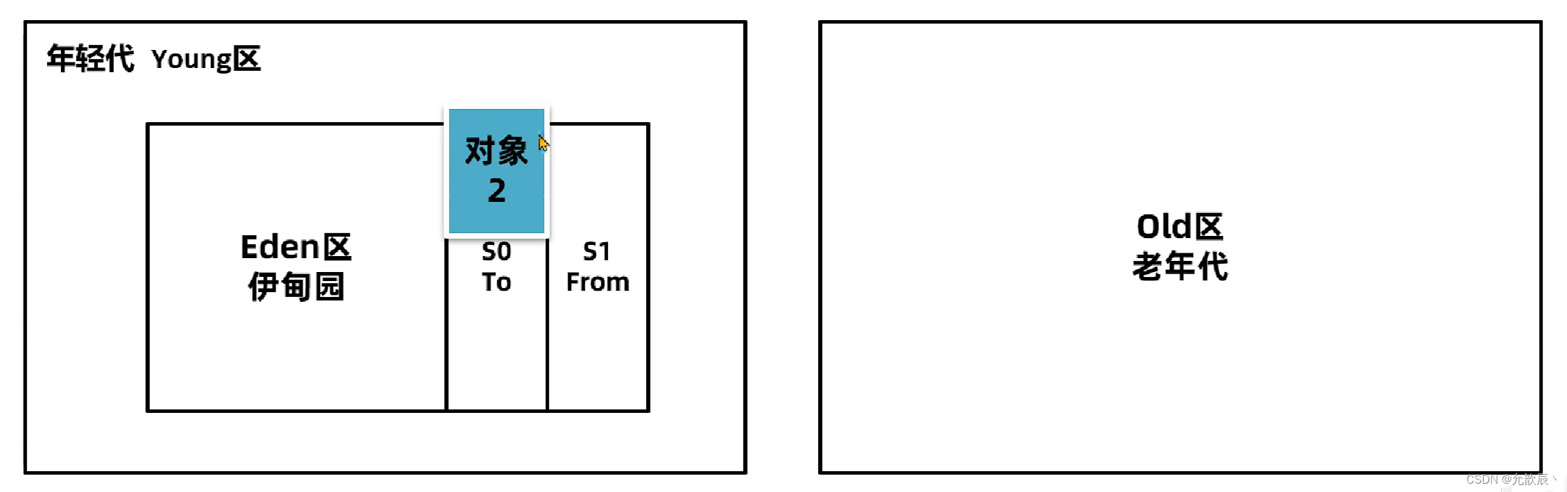 接下来,SO会变成To区,S1变成From区。当eden区满时再往里放入对象,依然会发生Minor GC.此时会回收eden区和S1(from)中的对象,并把eden和from区中剩余的对象放入S0。