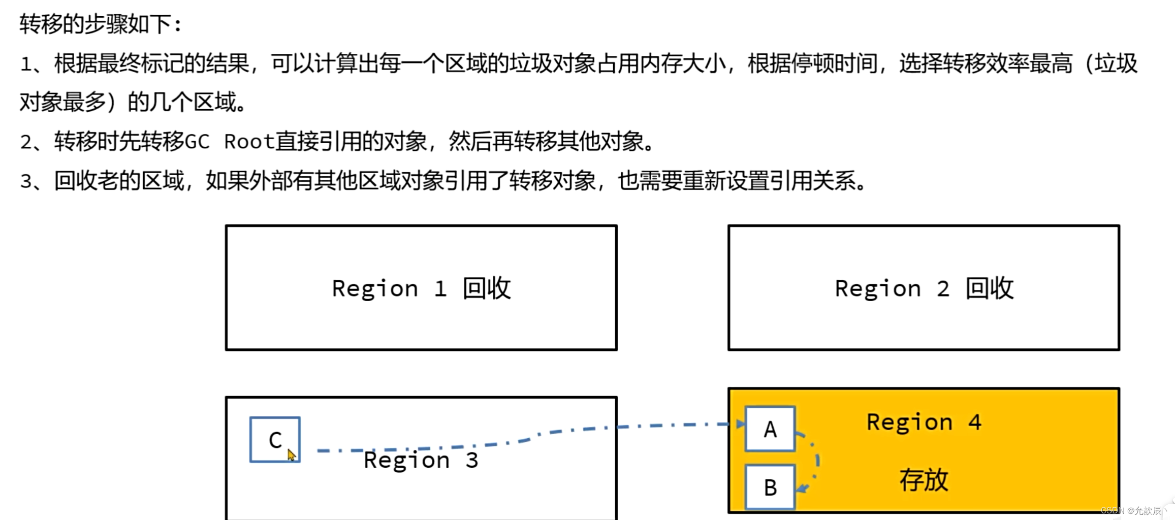 - 筛选回收:负责更新Region的统计数据,对各个Region的回收价值和成本进行排序,根据用户所期望的停顿时间来制定回收计划,可以自由选择任意多个Region构成回收集,然后把决定回收的那一部分Region的存活对象复制到空的Region中,再清理掉整个旧Region的全部空间。这里的操作涉及存活对象的移动,是必须暂停用户线程,由多个收集器线程并行完成的。