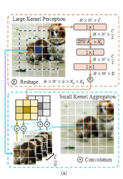 感知(Perception)与聚合(Aggregation)的解耦:感知阶段:采用大内核卷积(如 7×7)扩大感受野,捕捉全局上下文关系,类似人类外围视觉的大视野感知。聚合阶段:利用小内核动态卷积(如 3×3)在高相关区域进行自适应特征融合,类似中央凹的精细聚焦。