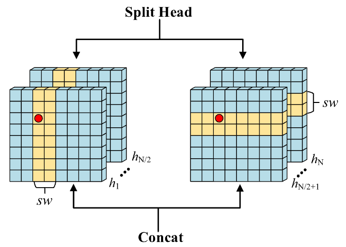 并行自注意力计算模块:将 N 个注意力头平均分为两组,第一组对水平条纹逐一计算自注意力(通过 Query、Key、Value 矩阵变换与 Softmax 归一化实现),得到水平自注意力输出(H-Attention);第二组对垂直条纹执行相同的自注意力计算流程,得到垂直自注意力输出(V-Attention),两组计算并行进行以提升效率;