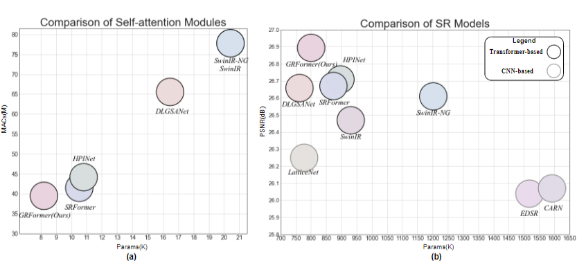 在单图像超分辨率(SISR)领域,Transformer架构虽已成为主流,但其自注意力机制存在根本性缺陷:计算复杂度与输入尺寸呈二次方增长,导致高分辨率图像处理时资源消耗剧增。如图1(a)所示,传统自注意力模块的参数量(Params)和乘加运算(MACs)远超轻量级场景需求,而现有优化方法(如SwinIR的窗口注意力)仍面临QKV生成冗余和位置编码低效两大瓶颈。尤其在实际应用中,移动端设备往往要求模型参数量控制在1M以下(如LatticeNet仅756K参数),传统方法难以兼顾性能与效率。GRSA的提出正是为了解决这一核心矛盾——通过分组残差结构和指数空间位置编码,在Urban100数据集上实现33.17dB PSNR(×2超分)的同时,将自注意力模块参数量降低60%,为边缘计算场景提供了新的技术路径。