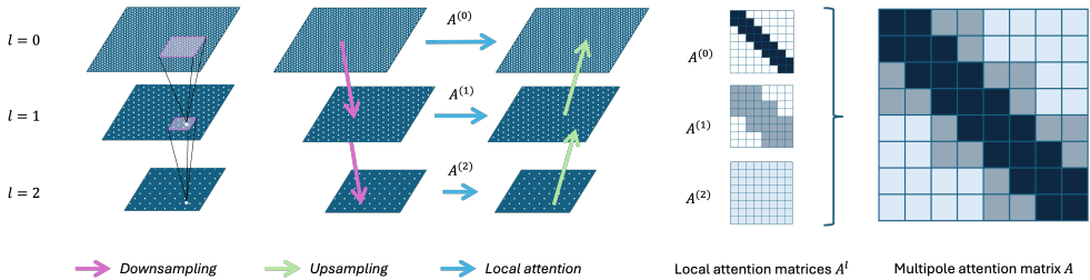 参数共享与复杂度:下采样/上采样卷积核及注意力权重在不同层级共享,确保参数效率。总复杂度为 O(N)(N为网格点数),显著优于全局注意力的
