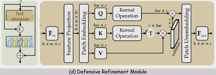 其核心在于先通过特征投影与补丁嵌入将输入特征转换为查询(Q)、键(K)、值(V),再利用 Pearson 相关系数衡量 Q 与 K 的相关性,验证核操作有效性;同时改变自注意力中的乘法顺序,先计算 K 与 V 的乘积,将复杂度从O(Nˉ2)降至O(N),在保证鲁棒性的同时提升对抗性训练效率,最终通过补丁解嵌入输出处理后的特征,实现对融合特征的细化。