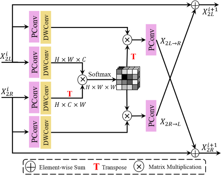 特征转换模块:通过 1×1 点卷积(PConv)调整特征通道数,再用 3×3 深度卷积(DWConv)提取局部细节,将输入的双视图特征分别转换为 Q、K、V 矩阵,为后续注意力计算做准备。