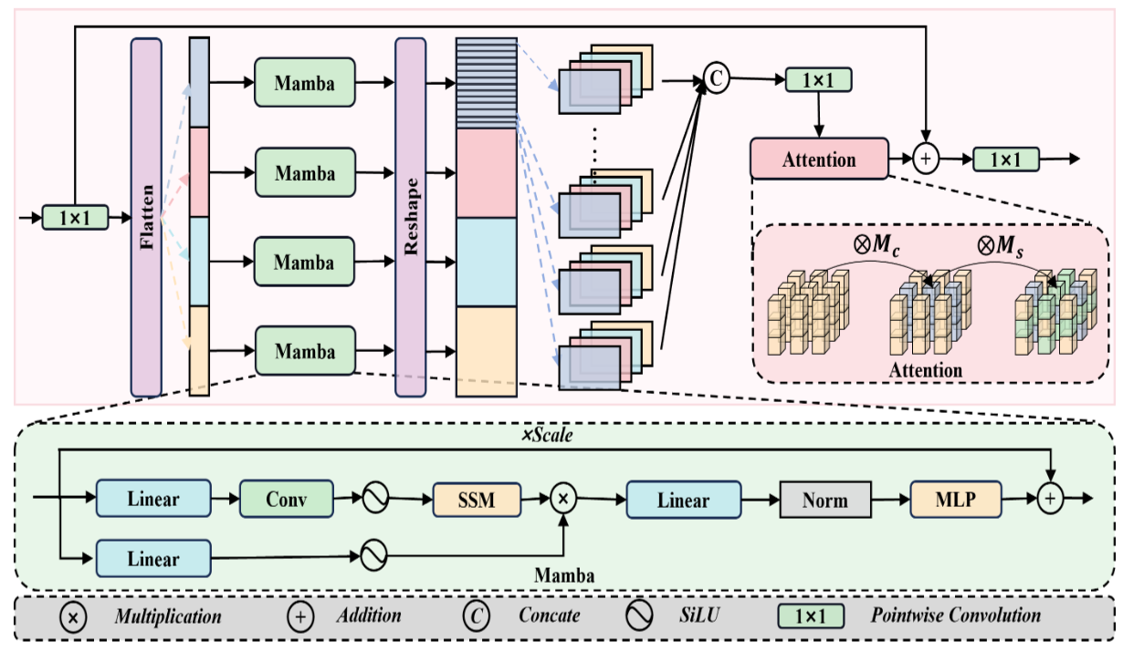 跨通道特征交互:针对状态空间层 “通道独立处理” 的局限性,引入跨通道重组与融合机制 —— 将各并行状态空间层的输出按通道索引重新分组,使不同并行分支中语义相关的通道特征汇聚,再通过 1×1 卷积与注意力机制(通道注意力 + 空间注意力)进一步筛选关键特征,强化通道间的互补信息,提升特征表达的完整性与判别性。