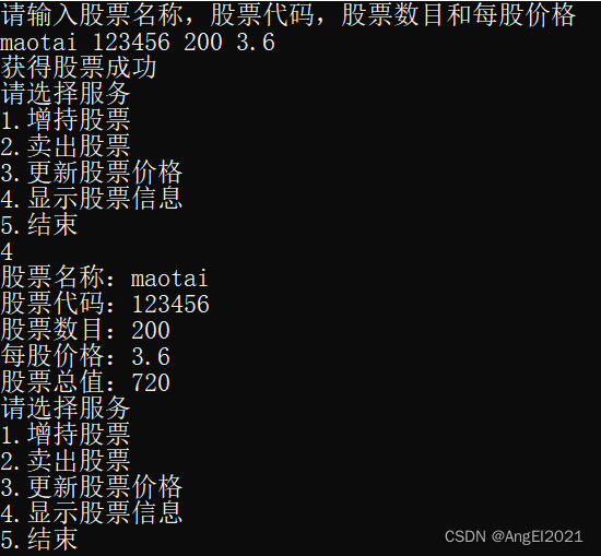 4.设计一个股票(Stock)类,包含股票名称、股票代码、股票的数量、每股的价格、股票的总值等属性,可完成获得股票(用构造函数完成)、增持、卖出股票、更新股票价格、显示所持股票的信息等行为。
