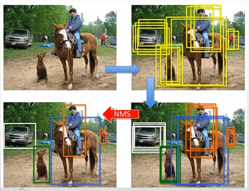 将2000*4096维特征与20个SVM(SVM是2分类,这里假设有20个类别)组成的权值矩阵4096*20相乘,得到2000*20维矩阵,每行表示每个候选框在20个类别的得分。之后对每一列进行NMS去除重复框。