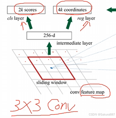 (1)过程:定义卷积核与特征图做卷积,计算出滑动窗口中心点对应到原图上的中心点,在原图上生成k个anchor,得到2k个score(每个anchor的背景概率和前景概率,不是哪个类别的概率)和4k个边界框回归参数(这些参数是RPN生成的)。