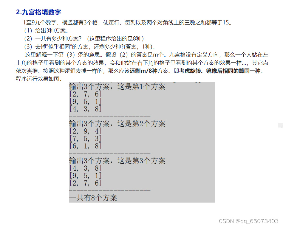 思路:就个数的排列组合为9!所以我们可以先用全排列算法把所有的组合写出了,然后将这个组合数三个一组切开,例如:123456789 切开后123 456 789 切成三行,接下来只需要验证这个切法的行,列,对角线是否为15即可!!