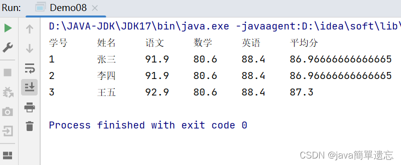 // 数学、英语这3科成绩,再计算每个人的平均分。运行结果如下: