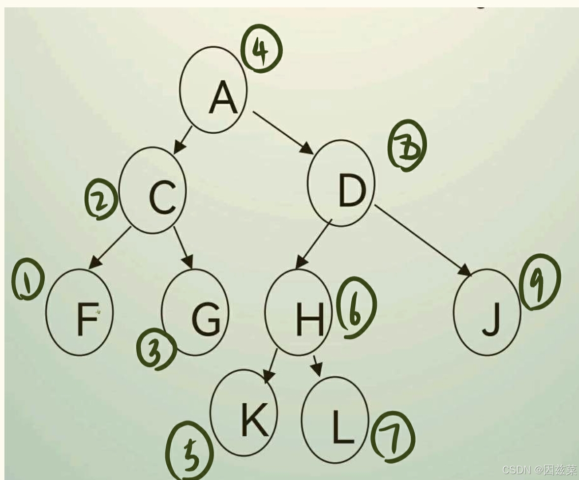 3.把左边的所有元素在前序(后序)中圈出来(其一定是全部挨在一起的),如果是前序遍历,第一个元素就是根的左孩子,右边所有元素的第一个元素就是根的右孩子;如果是后序遍历,则左边所有元素的最后一个元素是根的左孩子,右边所有元素的最后一个元素是根的右孩子。