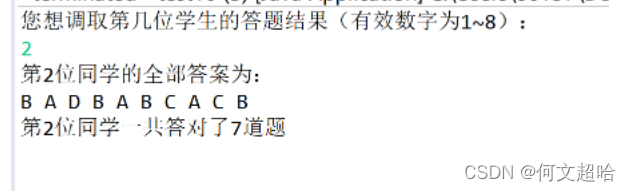 System.out.println("您想调取第几位学生的答题结果(有效数字为1~8):");//输出信息