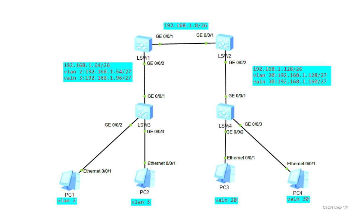 这篇博客详细介绍了如何配置OSPF路由协议,以确保基于192.168.1.0/24子网的网络中,PC1、PC2、PC3和PC4之间的全网可达性。配置涉及到多个交换机的VLAN划分、IP地址分配、Trunk接口设置以及OSPF区域和网络的定义。通过这些配置,实现了网络内部设备的互通。