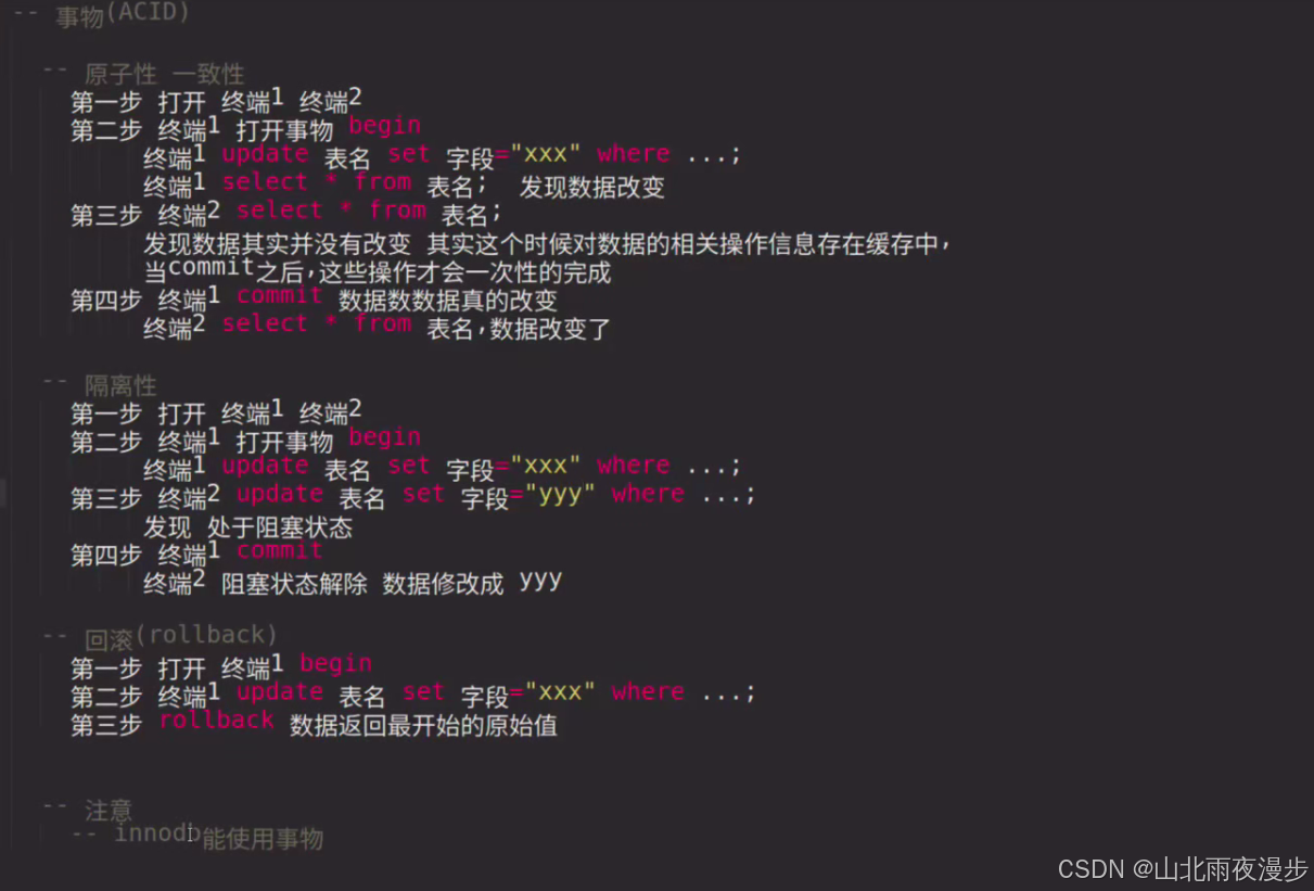 update语句,此时终端 2 也执行update语句会处于阻塞状态。直到终端 1 执行commit提交事务,终端 2 的阻塞状态解除,完成数据修改。 - 原理:展示事务的隔离性,一个事务的操作执行过程中会阻止其他事务对相同数据的操作,防止并发操作导致的数据不一致。