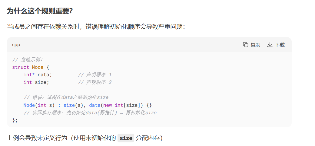 为什么初始化的顺序是变量的声明顺序?我觉得是C++语言自己就固定好,为了避免初始化程序时出现错误提前定死的。在构造函数里面,初始化列表的变量初始化顺序与列表中变量的排列的顺序无关,是与类或者结构体中,变量的声明顺序一致。当不满足上面的一致性要求时就会出现,下图的情况: