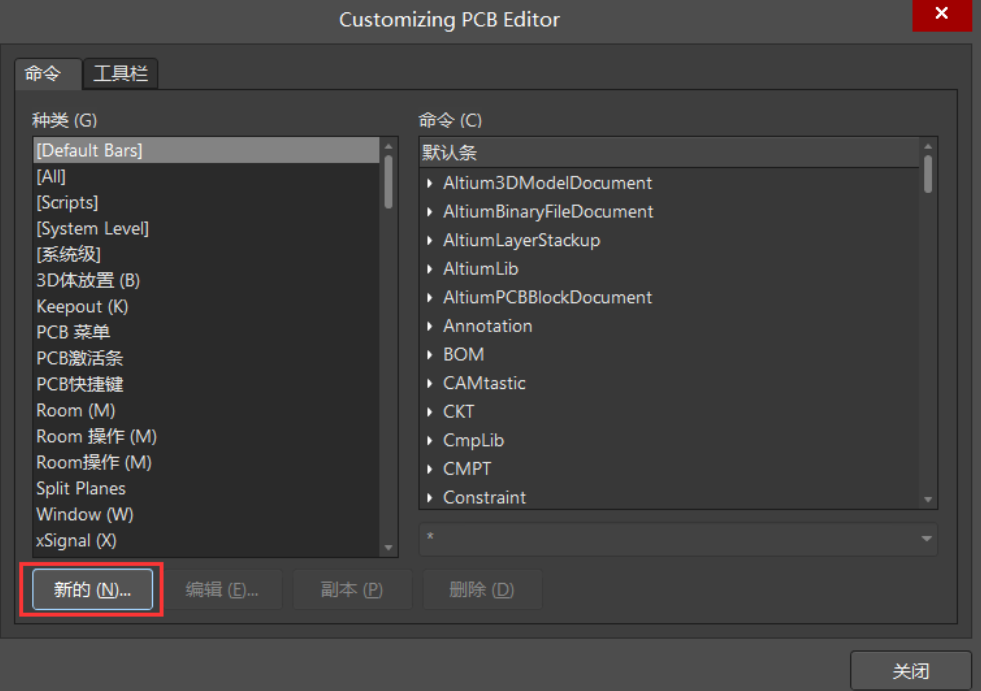 点击菜单栏->视图->工具栏->自定义后,弹出下面这个对话框,选择左下角“新的”命令:
