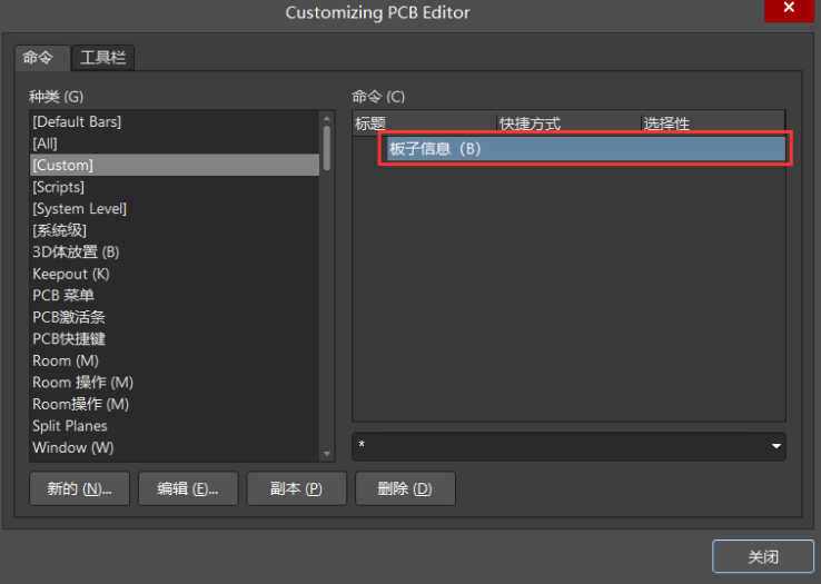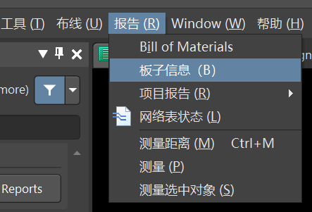 鼠标左键点住“板子信息(B)”命令不放,直接拖到菜单栏->报告下面即可生成板子信息查看命令: