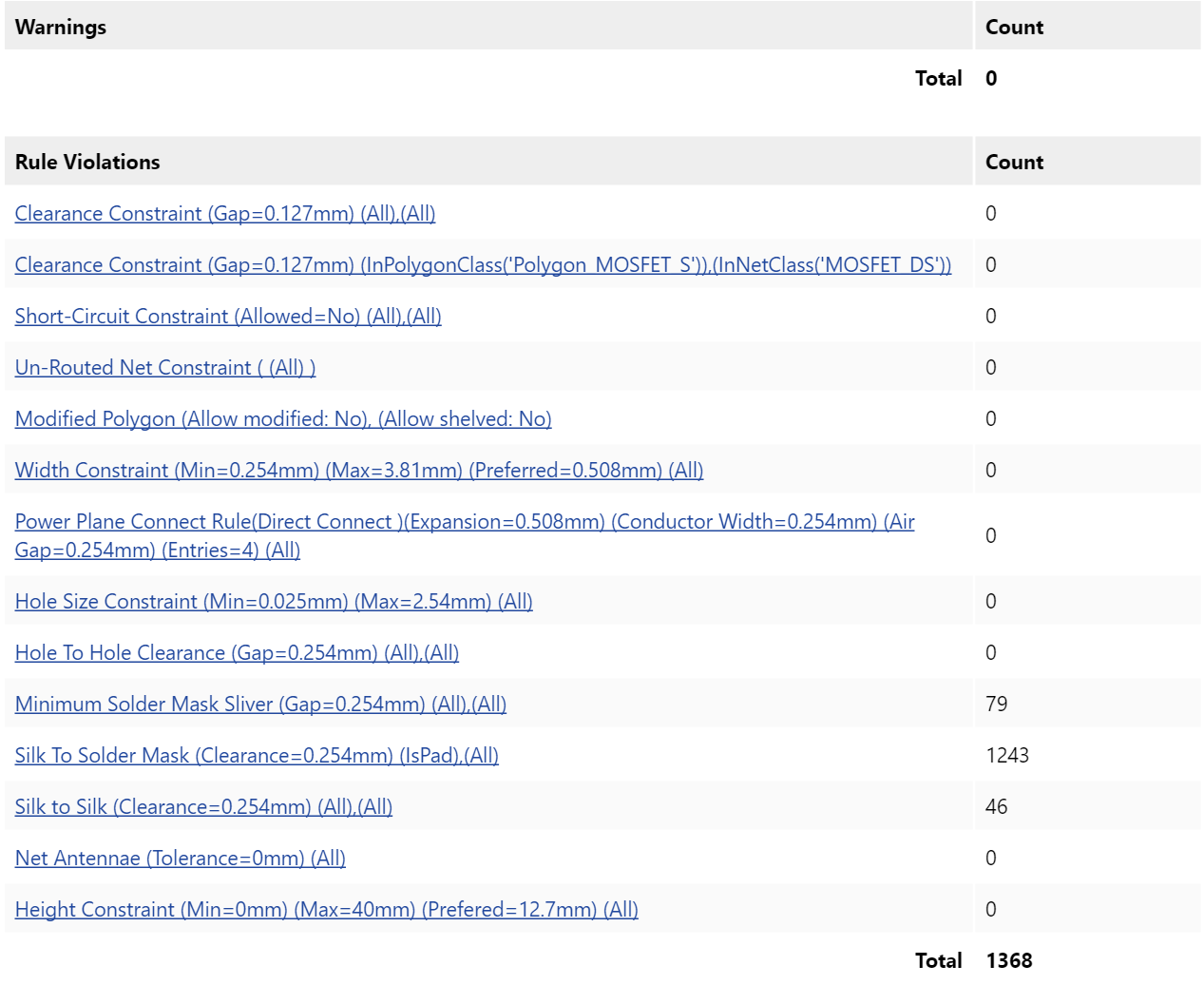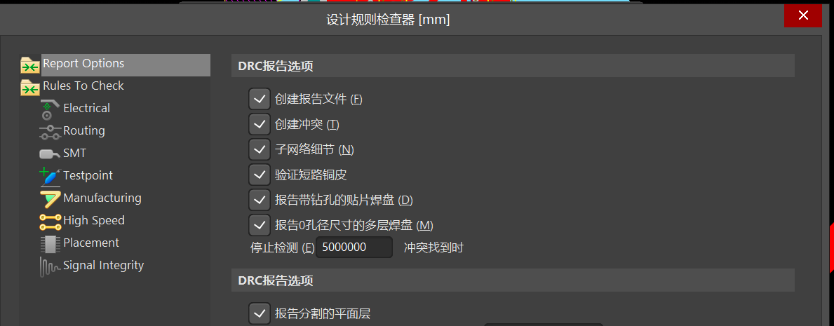 设计规则检查,就是DRC相当重要!可以检查出没连接的网络、短路的网络等等,但是注意,修改“当....停止”为最大。这里的意思是当检查到这个数量的错误时,就停止检查,如果设置得太小,可能就会因为运行不到检查布线处就停止检查了,这样就检查不出那个网络是否布线完整。建议修改到足够的,耗点点时间而已,默认是500,可以改为500000。因为会有很多丝印的错误,比如如下图,丝印问题都占据了1358个,但是丝印距离问题都不是大问题。
