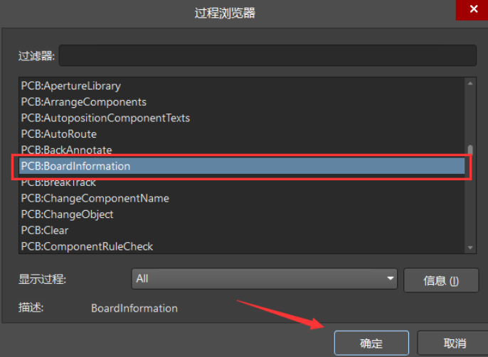 在弹出的列表中下拉找到“PCB:BoardInformation”选项,点击确定: