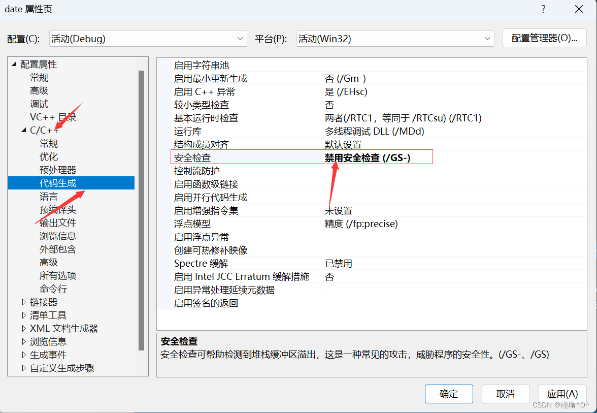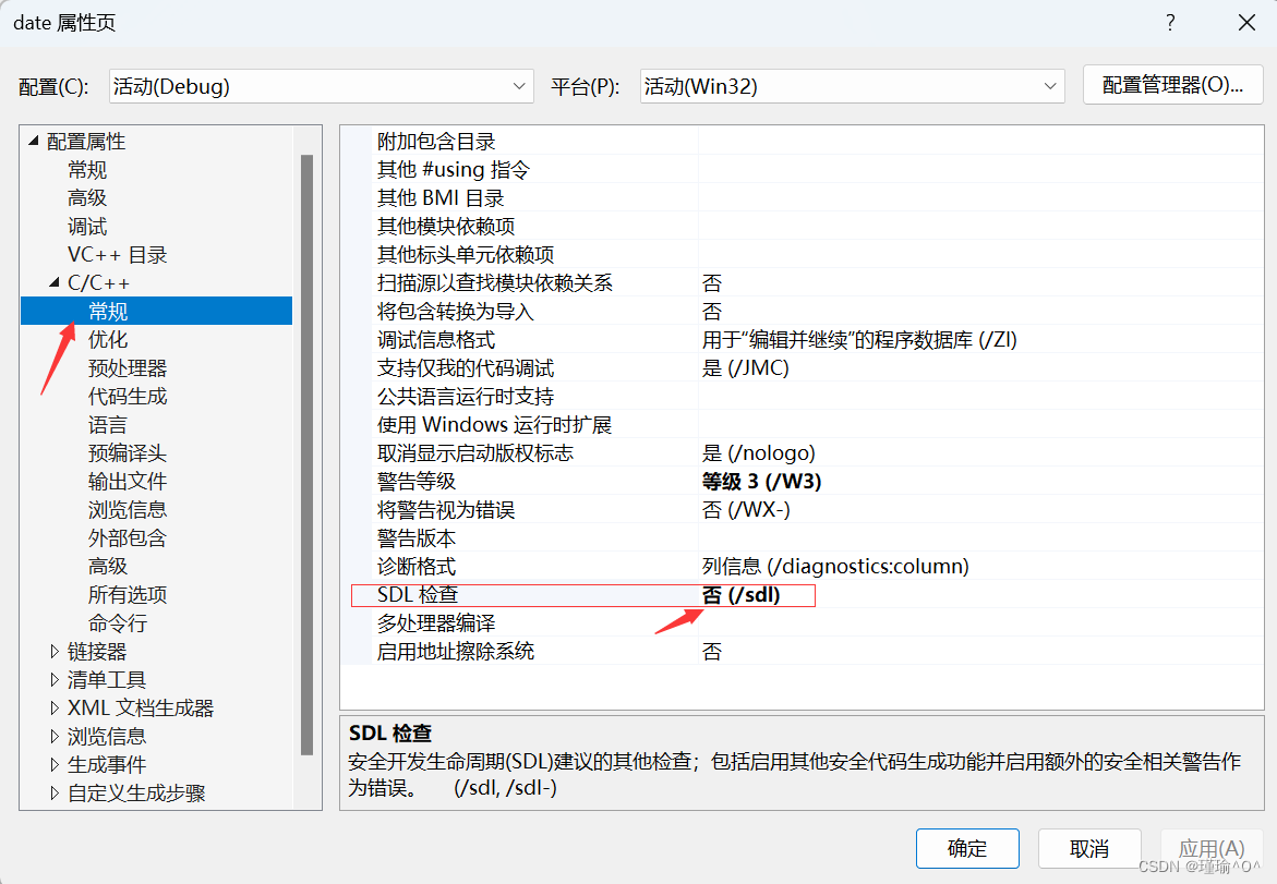 方法三.改属性,只需在新建项目时取消勾选“SDL检查”。若项目已建立好,在项目属性里关闭SDL即可