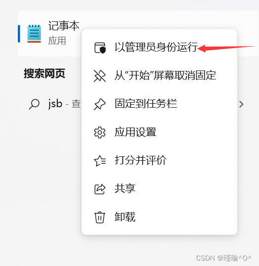 在搜索框--->搜索记事本--->单击右键--->以管理员身份打开