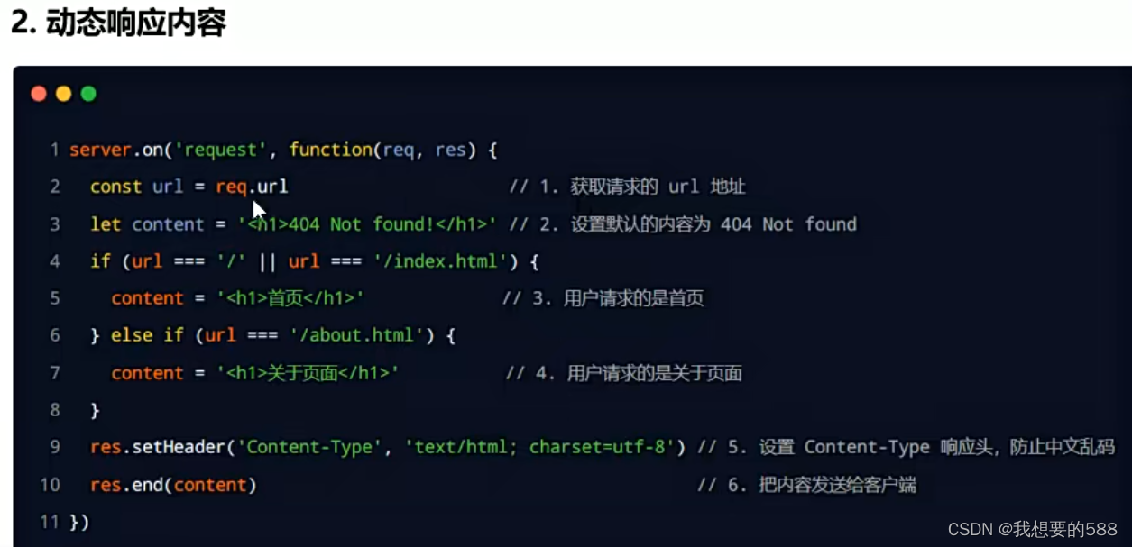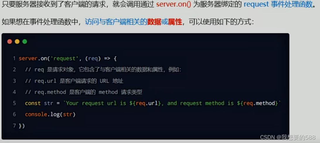 req是请求对象,它包含了客户端相关的数据和属性,例如:req.url , req.method