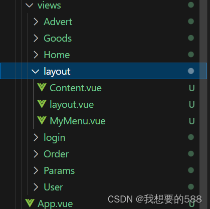 这里(已易购商城后台为例),创建了登录页Login,主页面基本骨架Layout=>在Layout文件夹下创建了Content.vue(内容区域)、layout.vue(基本骨架)、MyMenu.vue(导航菜单)三个vue文件。