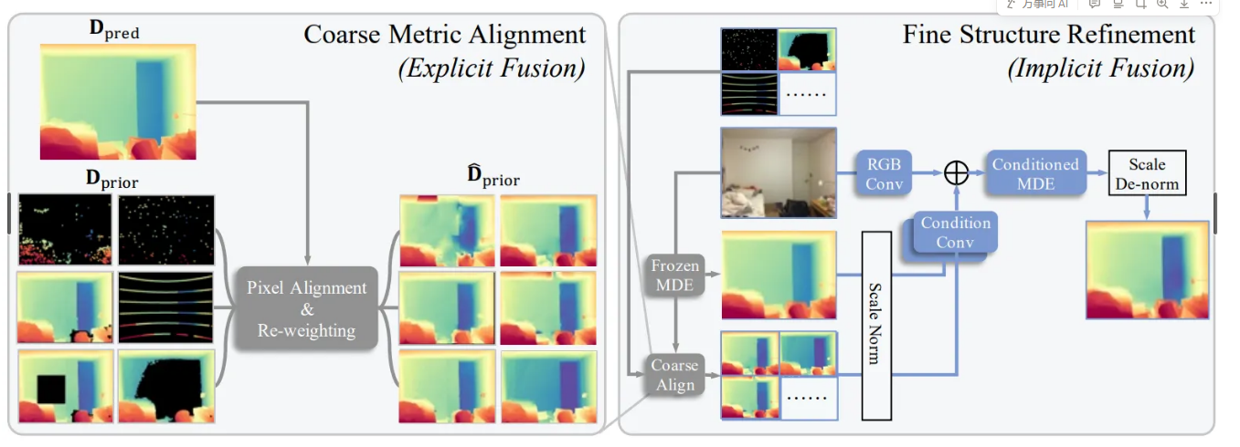 论文目的:结合不完整但精确的深度测量信息与完整但相对的深度预测信息来生成一张准确且完整的深度信息