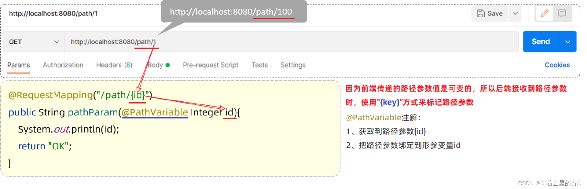 后端:使用{…}来标识该路径参数,需要使用@PathVariable获取路径参数