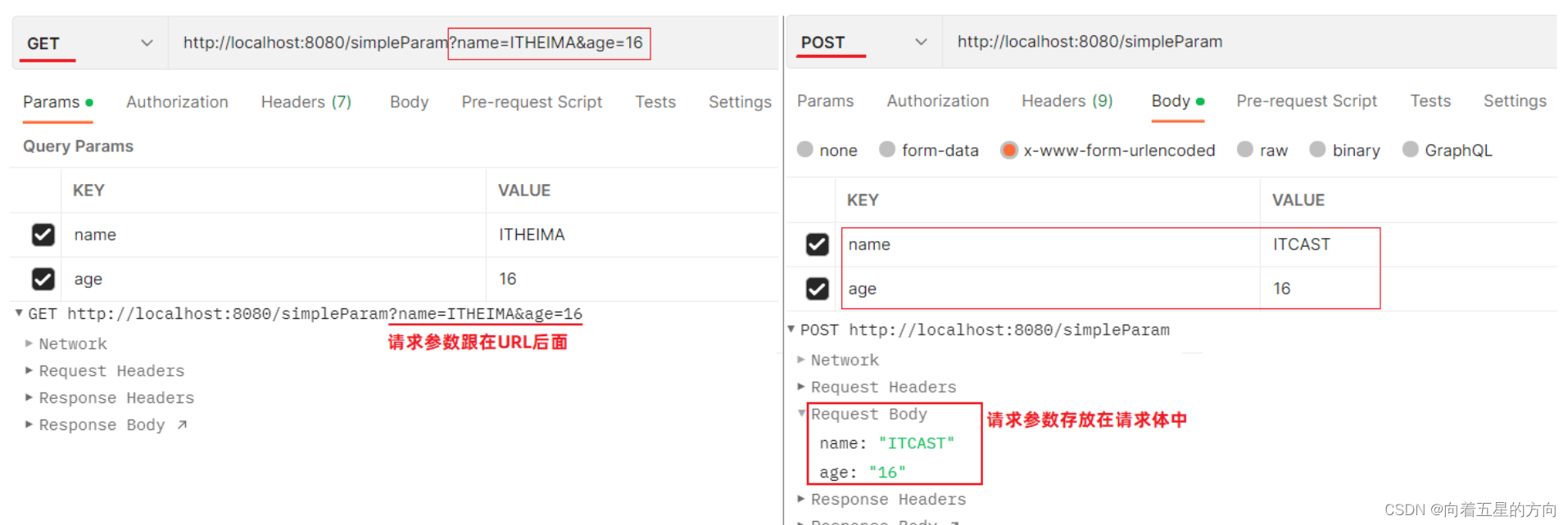 传统的开发中请求参数是放在请求体(POST请求)传递或跟在URL后面通过?key=value的形式传递(GET请求)。