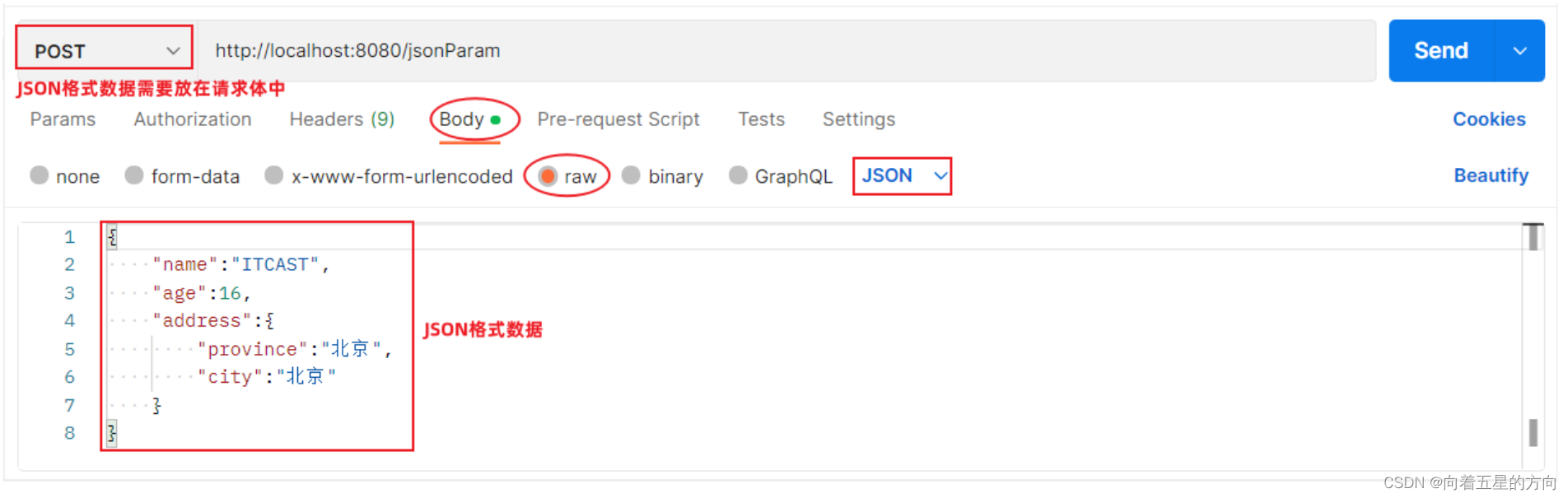 封装规则:JSON数据键名与形参对象属性名相同,定义POJO类型形参即可接收参数。需要使用 @RequestBody标识。