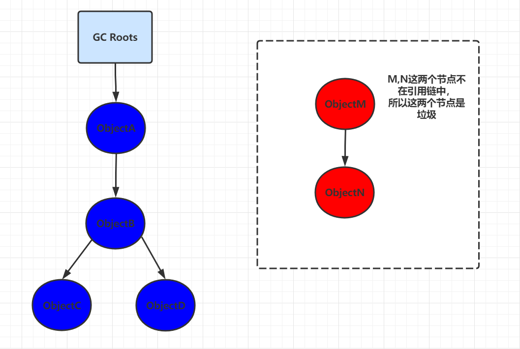 如果目标对象没有任何引用链相连,则是不可达的,就意味着该对象己经死亡,可以标记为垃圾对象