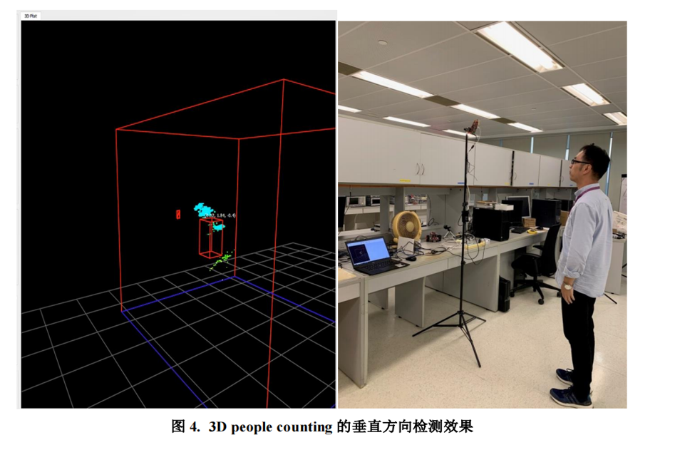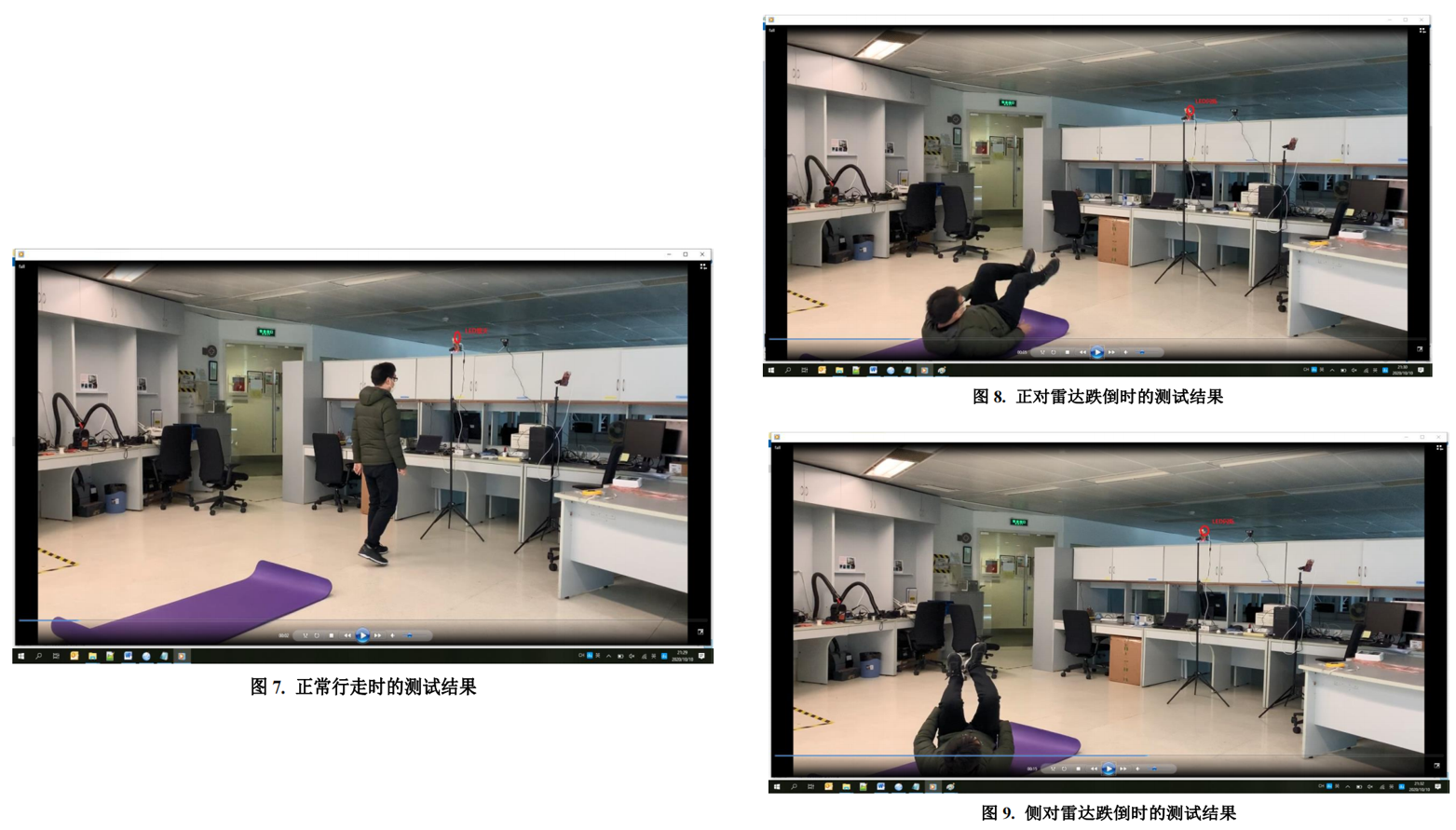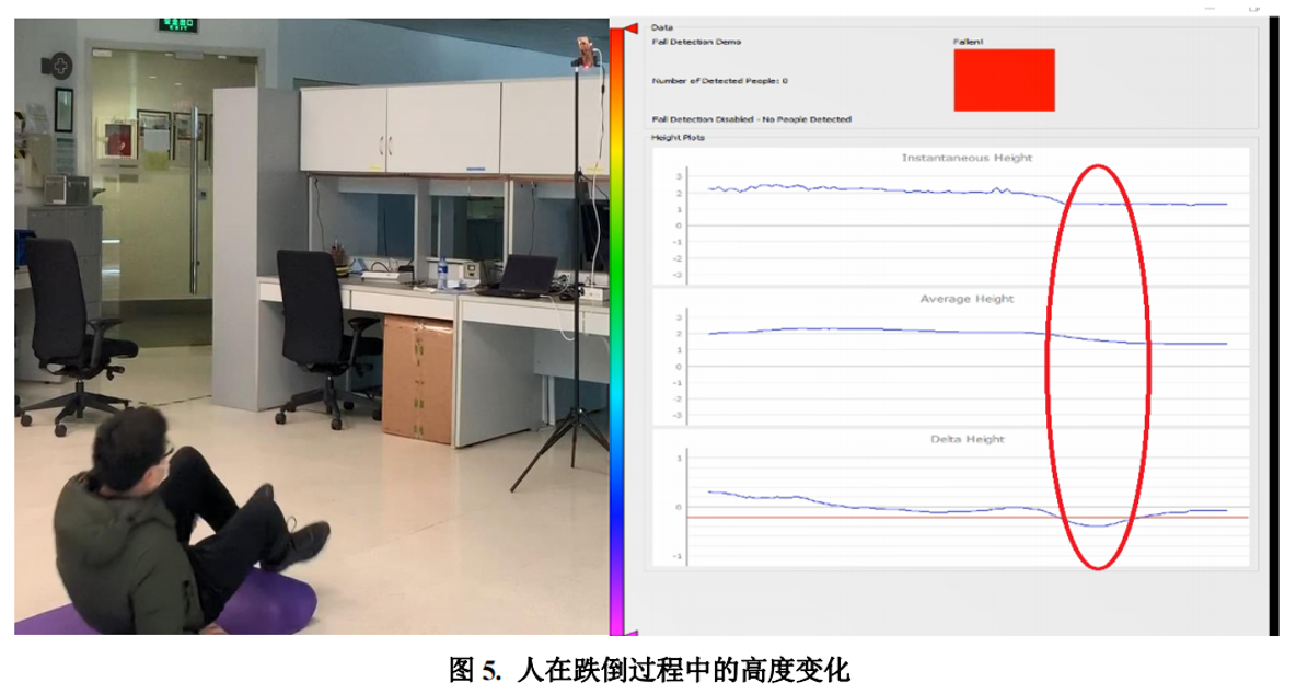 运行3D people counting,当人在雷达前运动的时候能够获得比较多的点云,可以计算出人的高度。人在跌倒的过程中,有一个高度快速下降的过程。当我们在获得了连续一段时间内人的高度信息后,通过比较人在不同时刻的高度差就能判断出有没有跌倒。