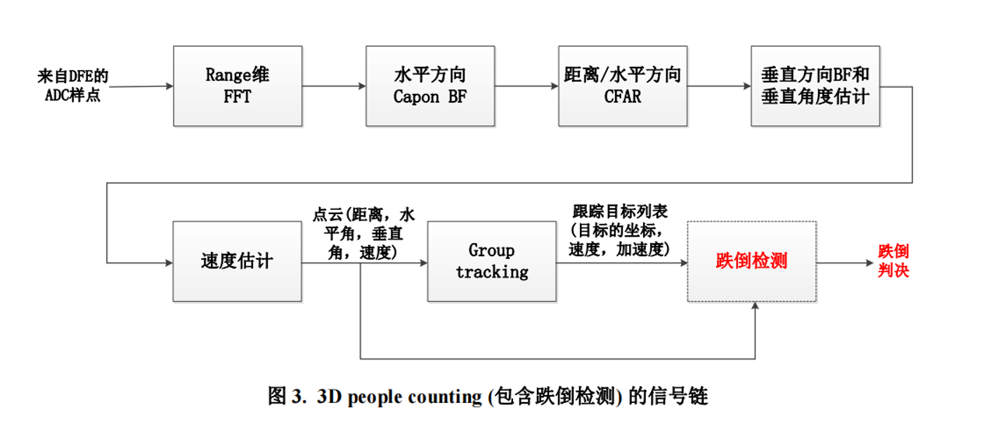 雷达需要有高的速度分辨率。通过速度信息来区别人和室内其他的静止物体 (比如桌子,床等),速度分辨率越高雷达就越容易把人从室内复杂的环境中提取出来,并生成更多的点云进行跌倒检测。