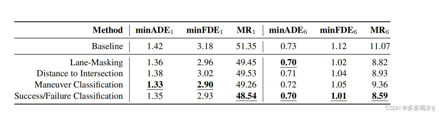 如图所示是几个困难情况下不同假设性任务的定性结果,在第一行中,车道掩膜成功地捕获了右转。对于第二行,预测到交叉口的距离对捕捉左转帮助最大。在第三行中,交叉路口处的加速度最好由机动分类的模型来捕获。最后,在第四行中,对成功的最终目标状态进行分类在捕捉左转方面是最有效的。