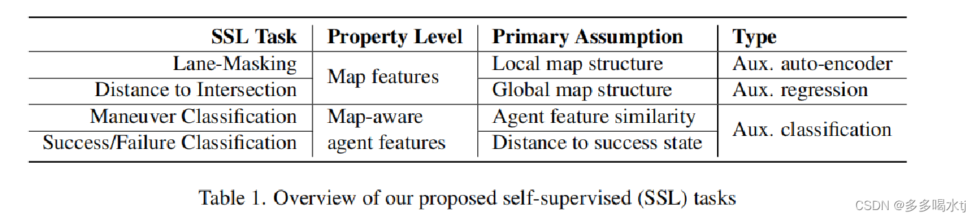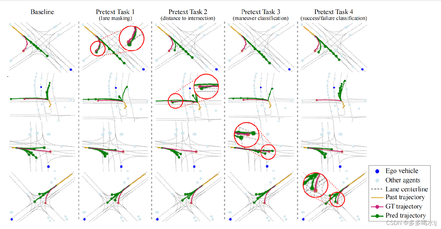 文章提出了四种前置任务,任务一是Lane-masking,车道屏蔽,任务二是Distance to Intersection,到路口交叉点的距离,任务三是机动分类,任务四是预测成功或者失败分类。