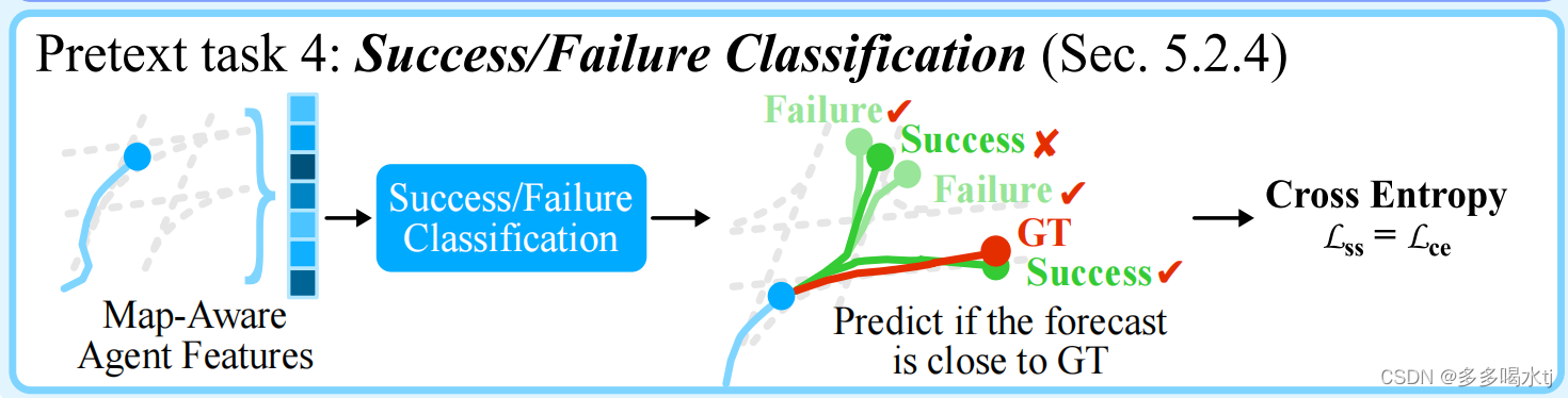 与提供对未来粗粒度预测的机动分类相比,自监督机制还可以通过车辆轨迹生成的goal-reaching任务提供丰富的学习信息。因此,进一步提出Forecasting Success/Failure Classification前置任务,其训练一个专门用于实现端点目标的代理。希望通过此项前置任务来限制模型预测远离正确终点的轨迹距离。