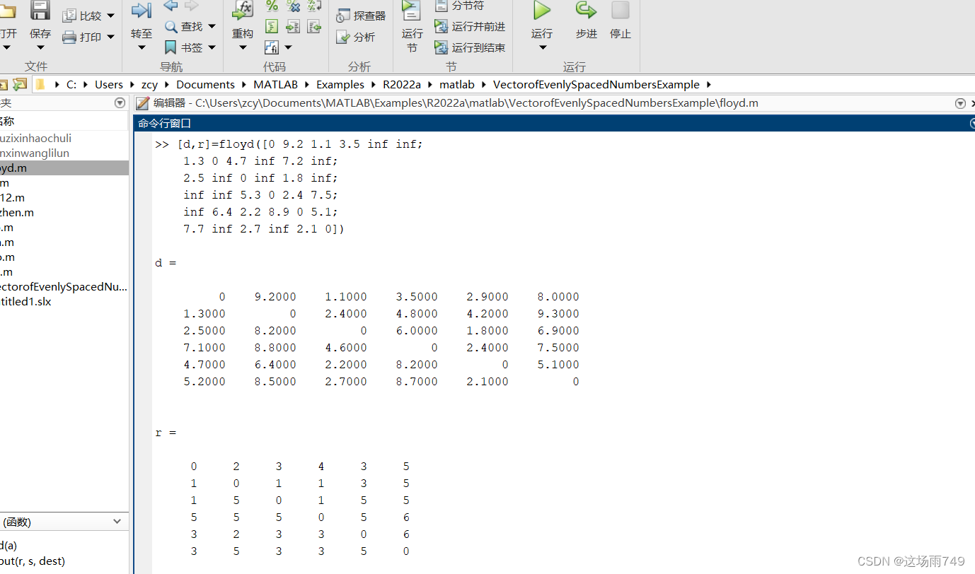 在命令行输入:[d,r]=floyd(填入已知的矩阵),确定运行即可。