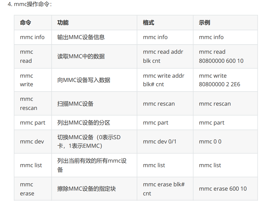 bootcmd保存着uboot默认命令, uboot倒计时结束以后就会执行bootcmd中的命令。例如:从emmc中读取内核、设备树、启动: