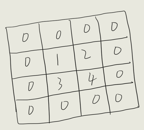 (1)先把输入每个像素周围补零(stride−1 行/列零):4×4 变成 7×7(因为 stride=2,相邻像素间插 1 行 1 列零)。如下图: